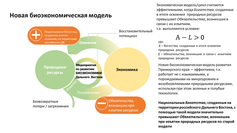 Новая биоэкономическая модель развития экономики ДФО станет эффективной, если будет работать не с изымаемыми, а порождаемыми на микроуровнях и возобновляемыми природными ресурсами, используя при этом зеленые и голубые технологии биоэкономики. Национальные богатства, созданные на территории российского Дальнего Востока, с помощью такой модели будут значительно превышать обязательства, возникшие при изъятии природных ресурсов по старой модели.