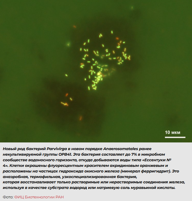 «60% мировых запасов железных руд сегодня составляют железисто-кремнистые формации докембрия, такие как Курская магнитная аномалия. Период их формирования длился около 1,5 млрд лет: это была настоящая железная эпоха планетарного масштаба. Считается, что в этот период на Земле процветали микроорганизмы, способные получать энергию от трансформации минералов железа. На изученном нами участке верхнемелового водоносного горизонта, откуда добываются популярные воды типа “Ессентуки № 4” и “Ессентуки № 17”, мы тоже обнаружили микробное сообщество, в большой степени специализирующееся на преобразовании минералов железа. В частности, нам удалось найти новую, ранее не культивируемую ветвь бактерий, представляющих собой облигатных железоредукторов: они могут использовать для получения энергии только минералы железа либо ионы железа в растворенном виде и водород. Это редкость для микроорганизмов, способных трансформировать соединения железа. Но в изученном нами микробном сообществе такие создания составляли его существенную долю, — поделилась Д.Г. Заварзина. — А в нижнемеловом горизонте, содержащем теплые воды со следами кислорода, бактериальные сообщества в очень большой степени представлены микроорганизмами с гибким метаболизмом. При наличии кислорода они сразу начинают использовать его в обмене веществ, потому что это самый энергетически выгодный окислитель для живых существ. Но их метаболизм может нормально функционировать и без кислорода. Таким образом, они могут использовать для поддержания жизни большое количество субстратов. Это не микробы с узкой специализацией, как бактерии в верхнеюрском горизонте, а универсалы, способные очень быстро подстраиваться под изменения окружающей среды. Предполагается, что такие организмы получили преимущество на Земле в период так называемой кислородной катастрофы, когда в атмосфере постепенно начал появляться кислород и произошел переворот в биосфере: аэробные процессы стали превалировать над анаэробными, что дало начало развитию сложных многоклеточных организмов.