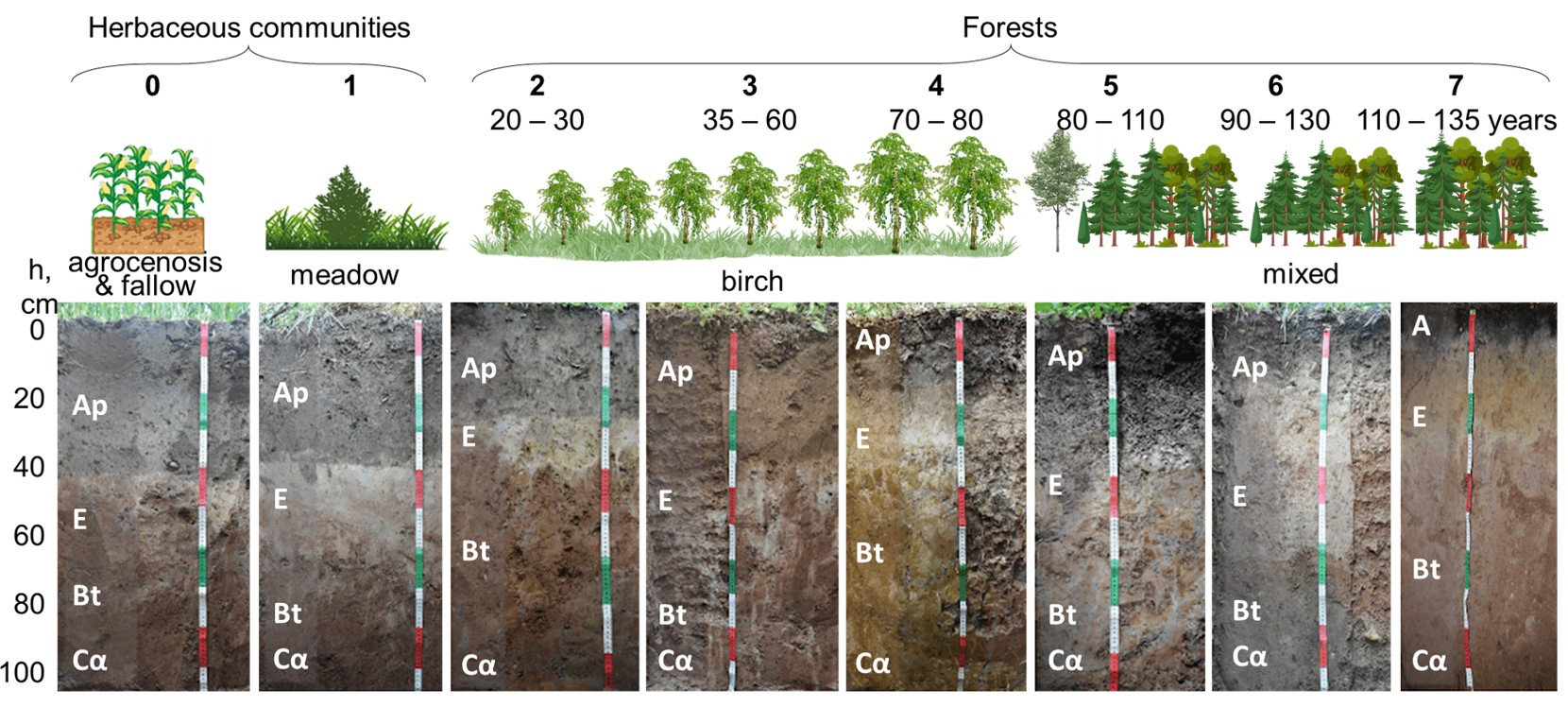 Оказалось, что по мере восстановления лесного покрова сильнее всего меняются характеристики самого верхнего гумусового горизонта почв, где накапливается большое количество связанных с органическим веществом элементов — азота, фосфора и серы, а также марганца, свинца и алюминия. При этом из-за того, что после прекращения распашки в почву не вносили удобрения, кислотность ее гумусового горизонта по мере восстановления лесного покрова увеличилась. Это ускорило вымывание из него подвижных соединений кальция, магния и стронция.